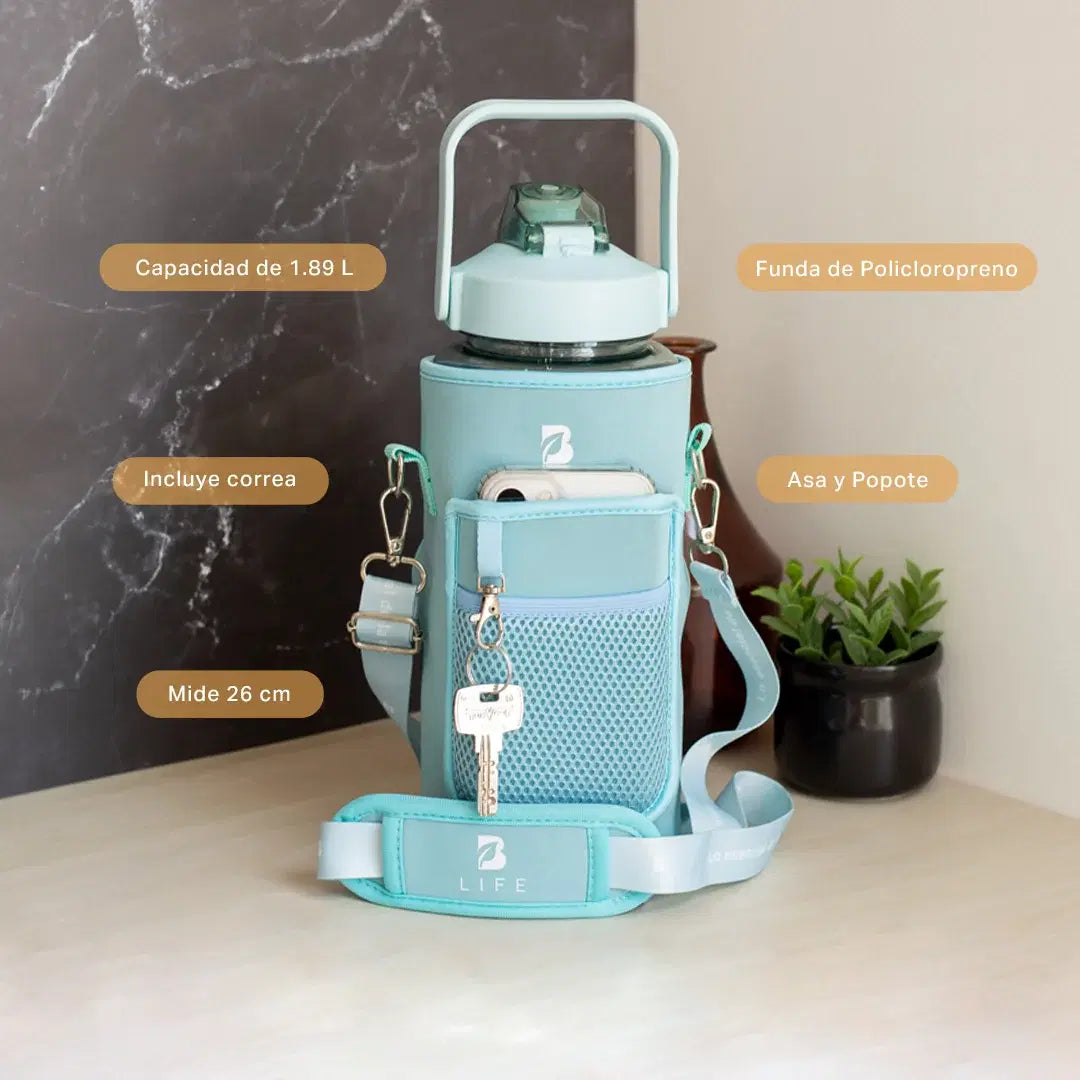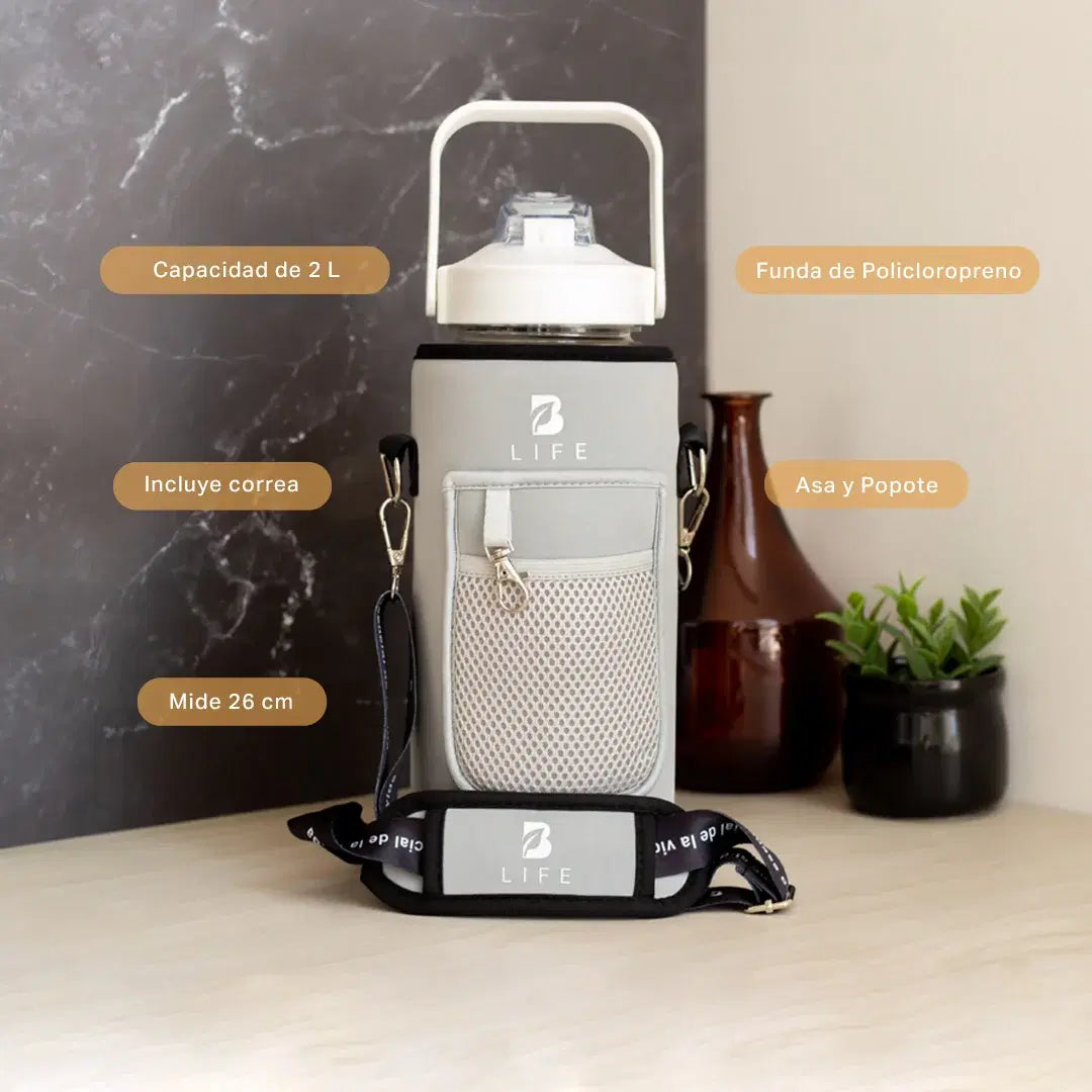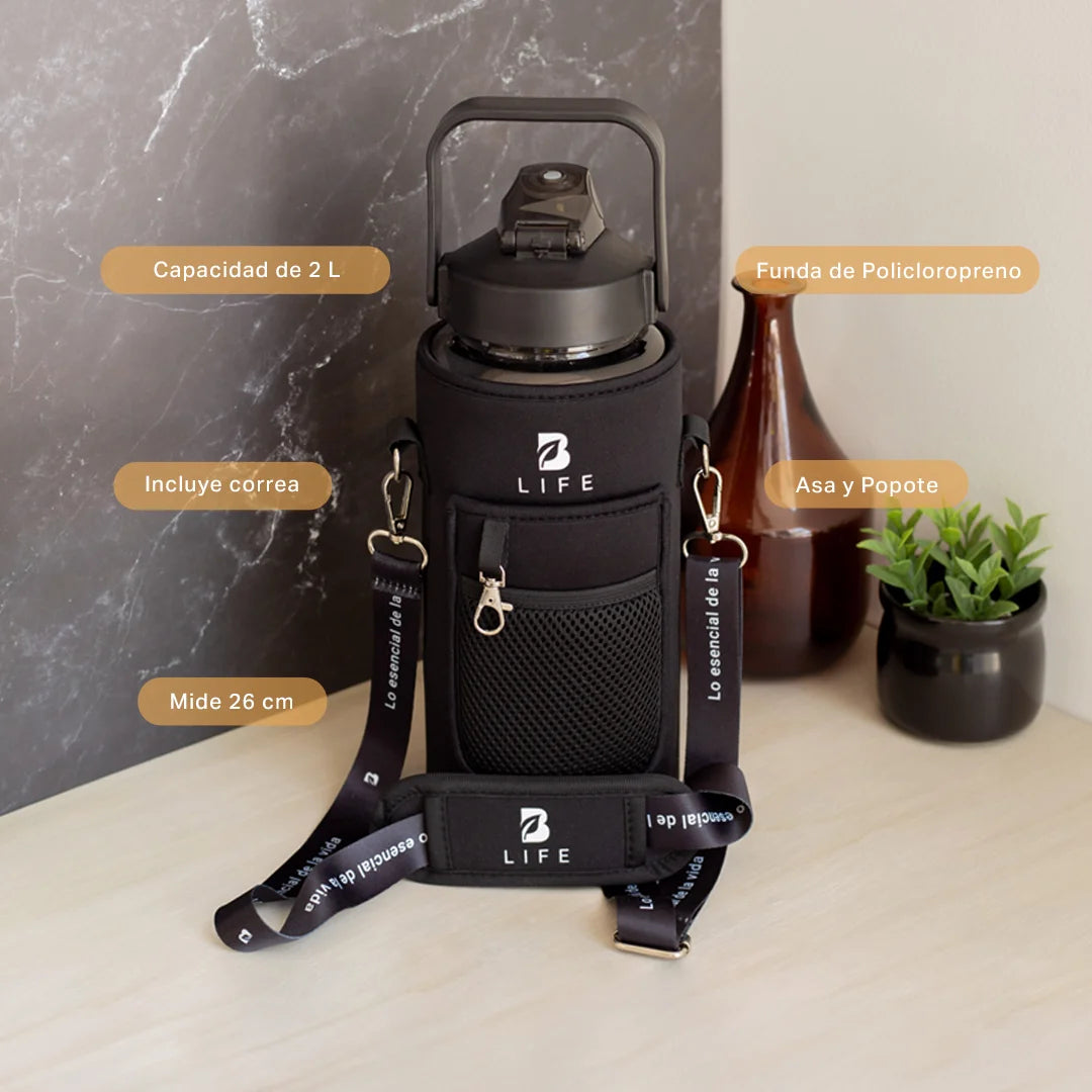 ¡Botella Motivacional B Life®, hidrátate con estilo! Esta botella libre de PET con capacidad para 2 L es el accesorio ideal para acompañarte a todos lados. Su funda de almacenamiento hecha de policloropreno, tiene una práctica correa para su fácil transportación, además de prácticos bolsillos para guardar tu celular o llaves.