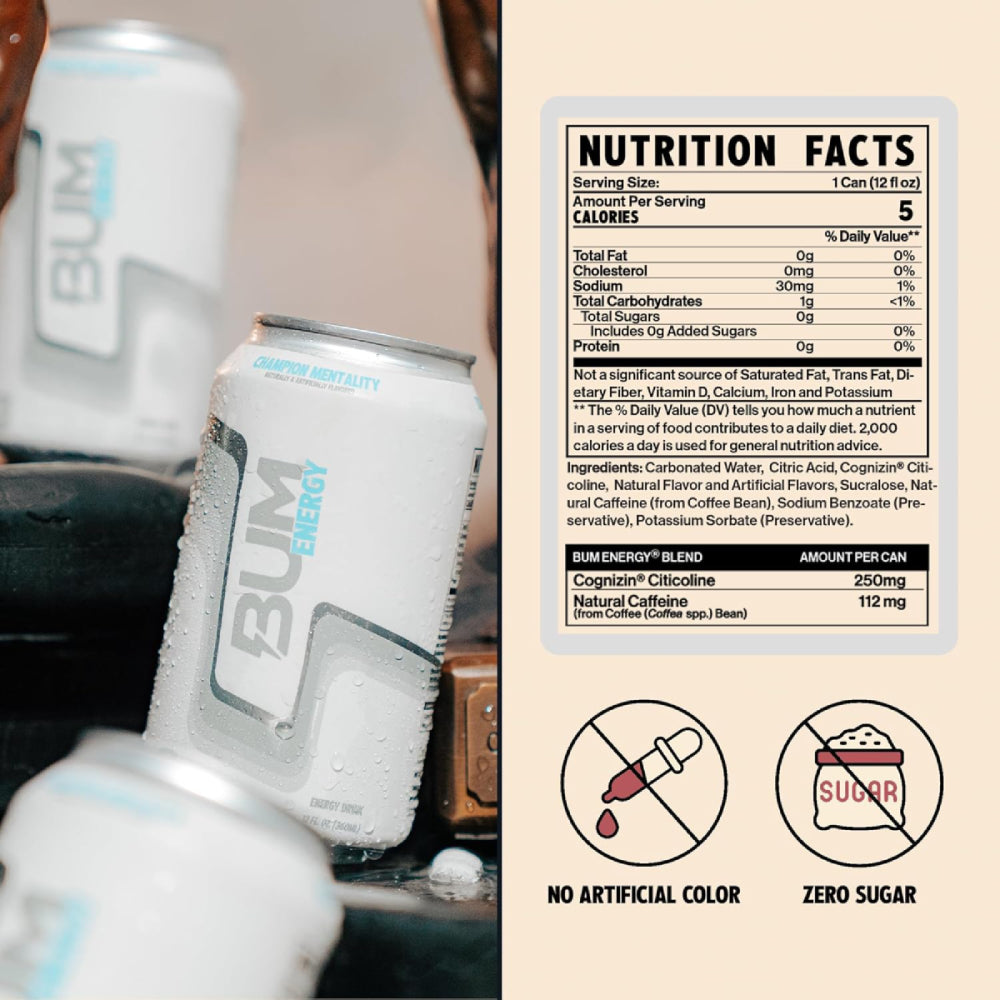 BUM ENERGY ⚡ es una bebida energética que contiene 112mg de cafeína por lata. No es muy recomendable combinarlo con estimulantes u otras fuentes de cafeína, incluido el café, té, refrescos, u otros suplementos alimenticios. No lo combines con alcohol.