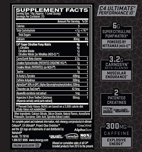 C4 Ultimate proporciona energía que puedes sentir, bombeo muscular y vasodilatación de gran alcance, resistencia muscular, concentración extrema, y máximo rendimiento. Todo lo que se necesita es un scoop para sentir la diferencia.