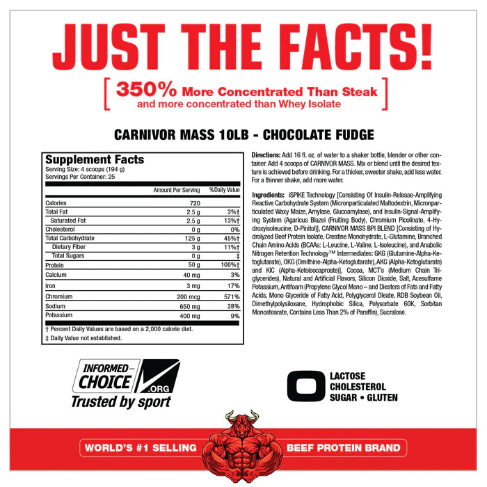 CARNIVOR MASS es excelente. Combina proteína de carne de res hidrolizada (BPI) único y de la mejor categoría con iSpike™. iSpike y BPI actúan en conjunto para apoyar con un máximo anabolismo muscular mientras minimizan el almacenamiento de grasa. CARNIVOR MASS es un ganador extremadamente rápido, limpio y altamente anabólico.