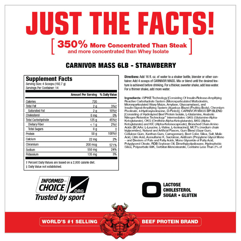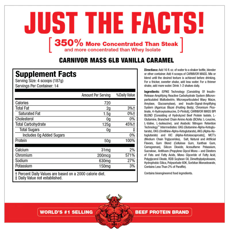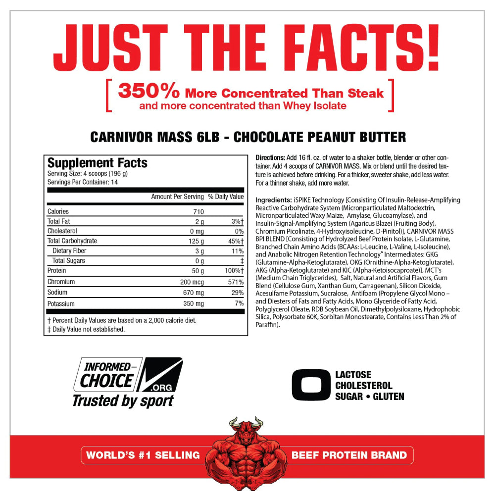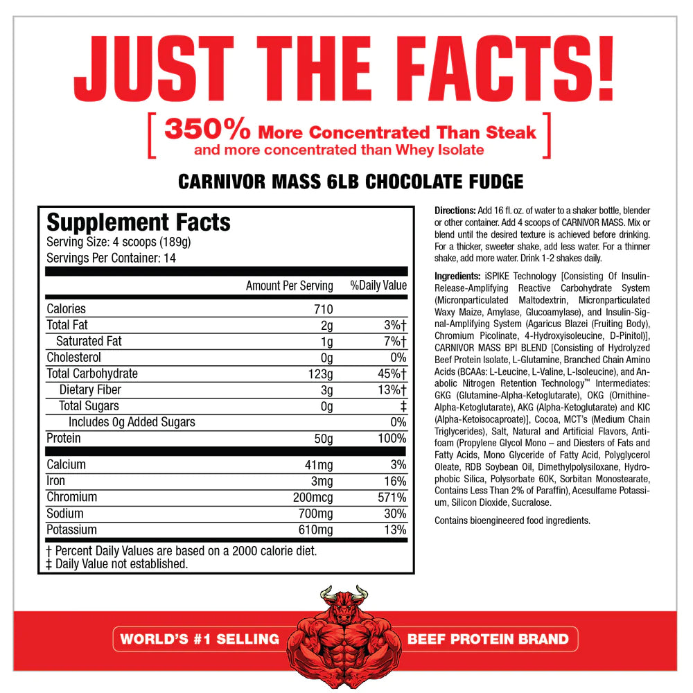 CARNIVOR MASS es excelente. Combina proteína de carne de res hidrolizada (BPI) único y de la mejor categoría con iSpike™. iSpike y BPI actúan en conjunto para apoyar con un máximo anabolismo muscular mientras minimizan el almacenamiento de grasa. CARNIVOR MASS es un ganador extremadamente rápido, limpio y altamente anabólico.