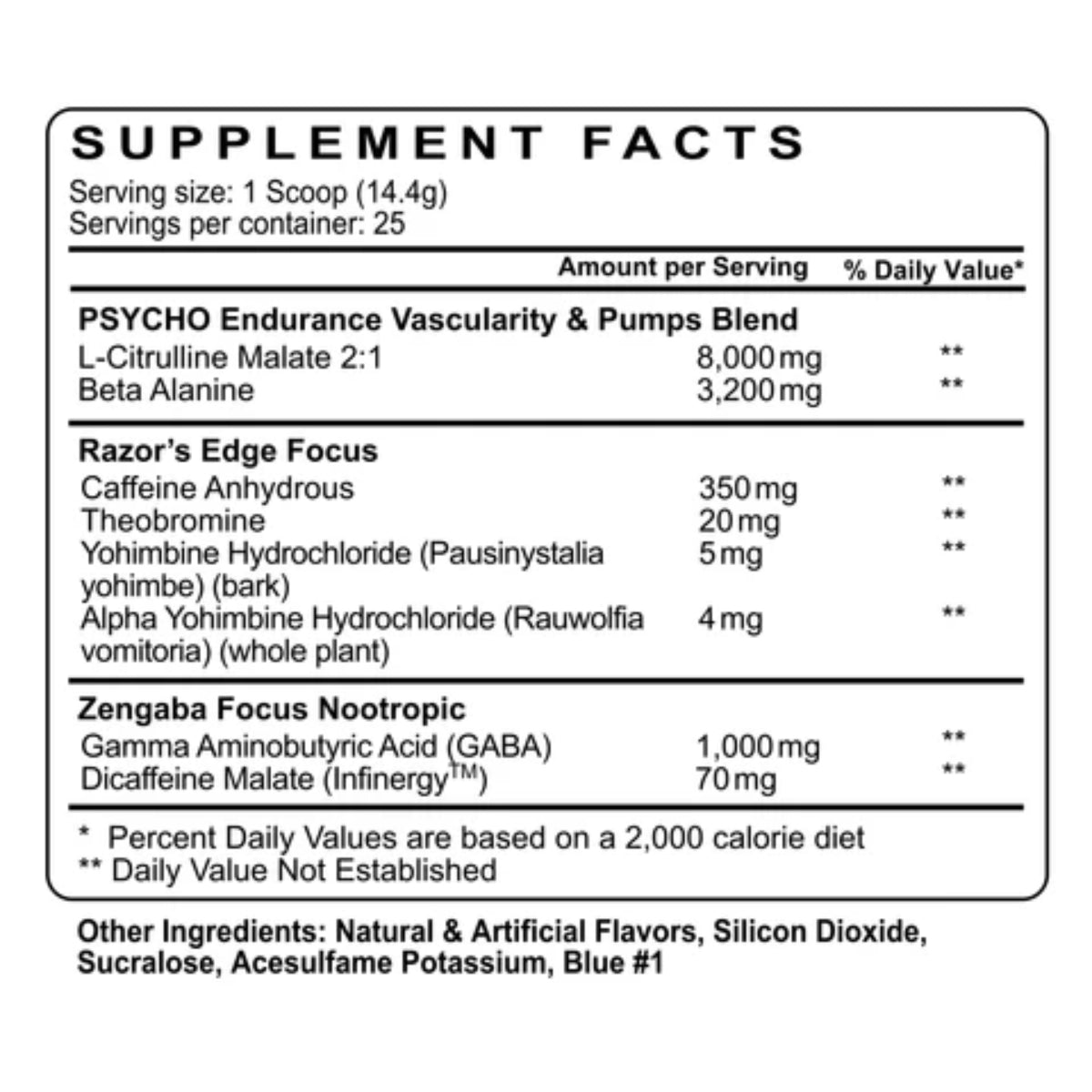Contenido | L-Citrulina, Beta Alanina, Ácido gamma-aminobutírico (GABA), Cafeína Anhidra, Dicafeína malato (Infinergy™), Teobromina, Yohimbe Hidroclorhídrica (HCL), Extracto de raíz de Rauvolfia Vomitoria (Yohimbe) |