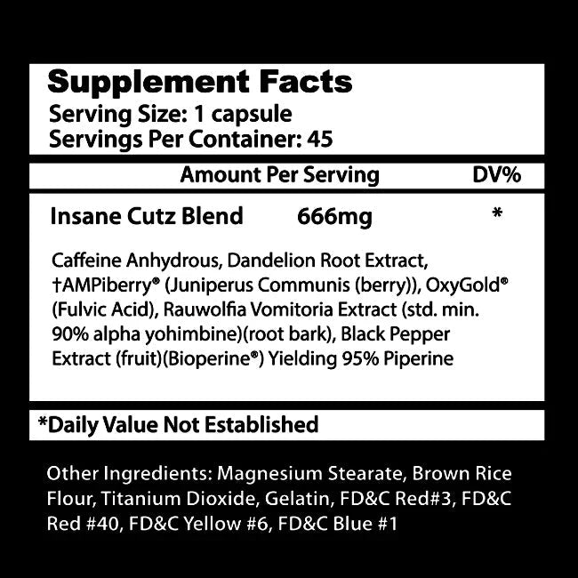 INSANE CUTZ es un quemador de grasa termogénico altamente estimulante formulado para aumentar tus niveles de energía al mismo tiempo que aumenta la quema de grasas. A diferencia de algunos otros quemadores de grasa del mercado, INSANE CUTZ es tan fuerte que solo necesitas tomar UNA porción al día.