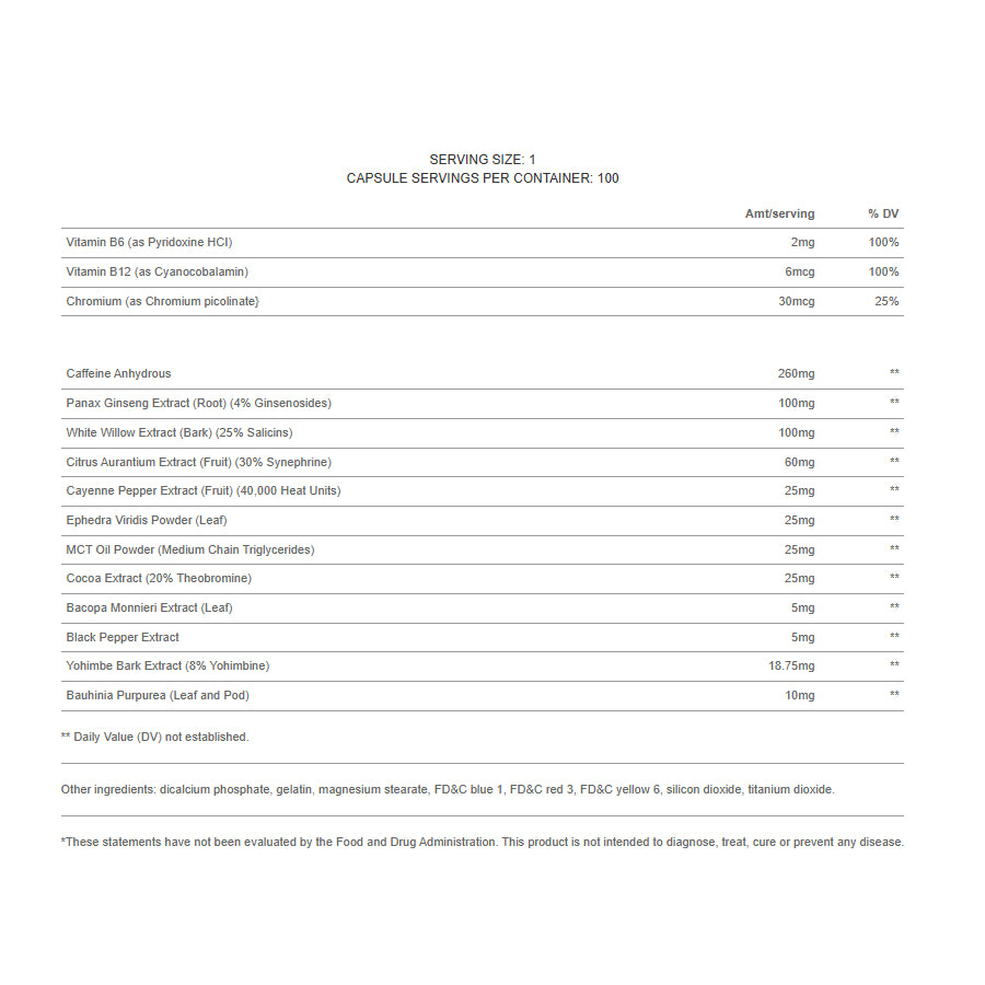 Contenido | Vitamina B6, Vitamina B12, Picolinato de Cromo, Cafeína Anhidra, Extracto de raíz de ginseng coreano (Panax ginseng), Sauce blanco en polvo (25% Salicilato), Extracto de naranja amarga (30% Sinephrina), Pimienta cayena, Extracto de hoja de Ephedra, Trigliceridos de cadena media (MCT), Extracto de cacao, Extracto de hierba ayurvédica Bacopa monnieri, Extracto de Pimienta negra, Yohimbe, Extracto de hierba y baya de Bauhinia purpurea. |