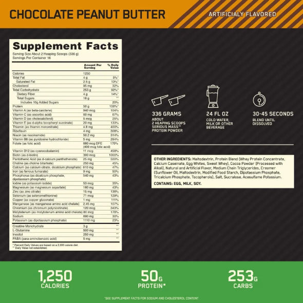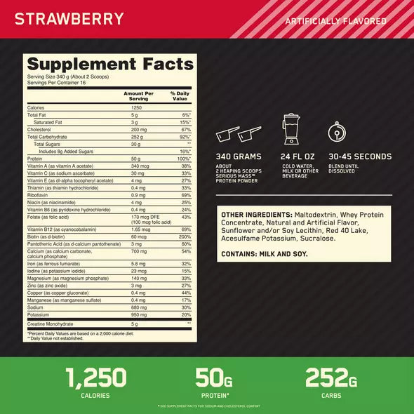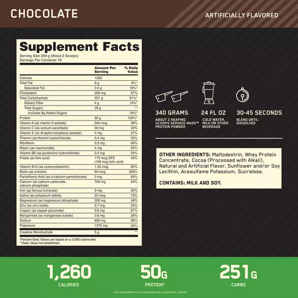 Mezclar 2 scoops de Serious Mass (apróximadamente 336 gramos) con 700ml de agua fría, leche descremada, o la bebida de tu elección en una licuadora. Mezclar muy bien durante al menos 30-45 segundos antes de beberlo.